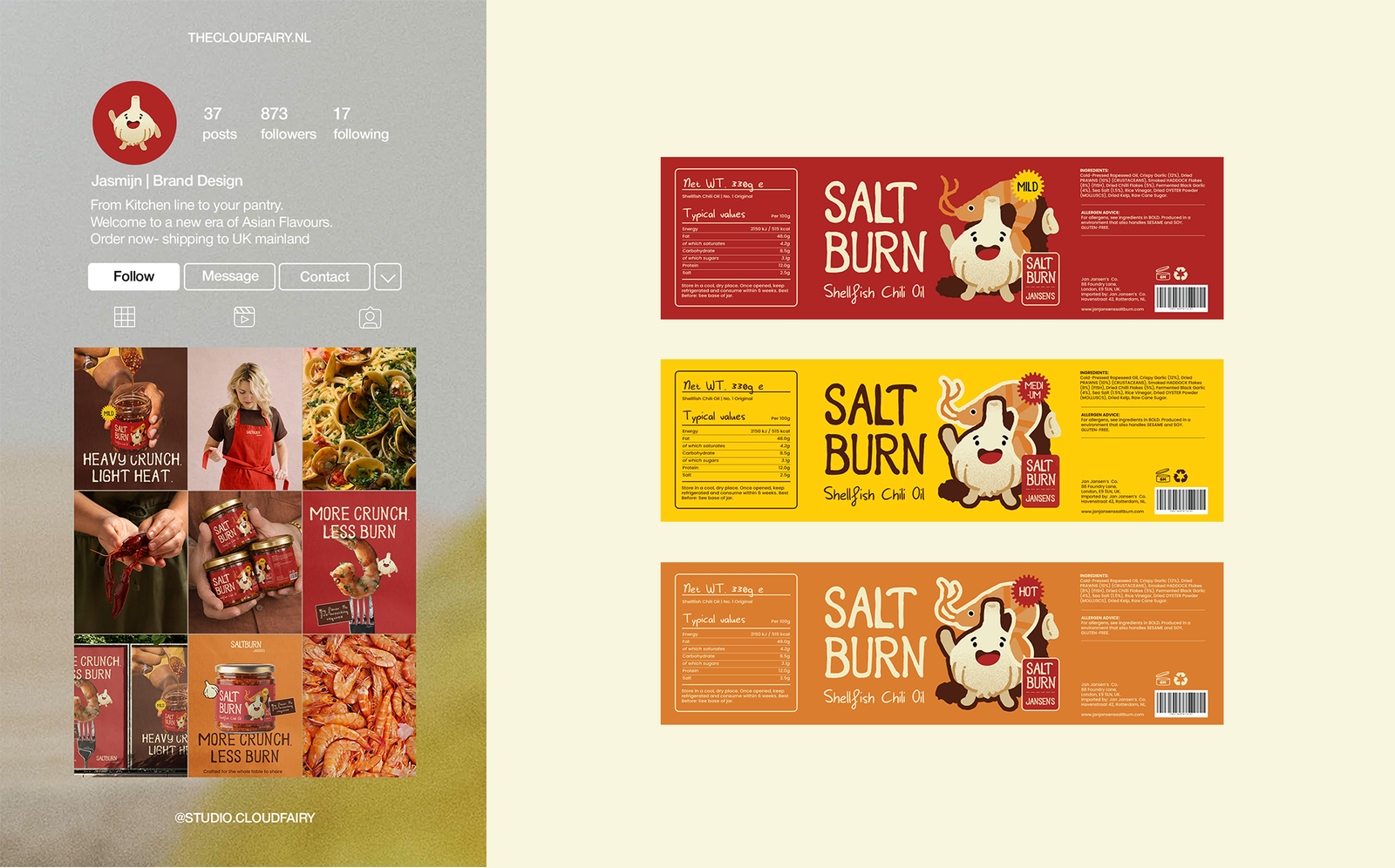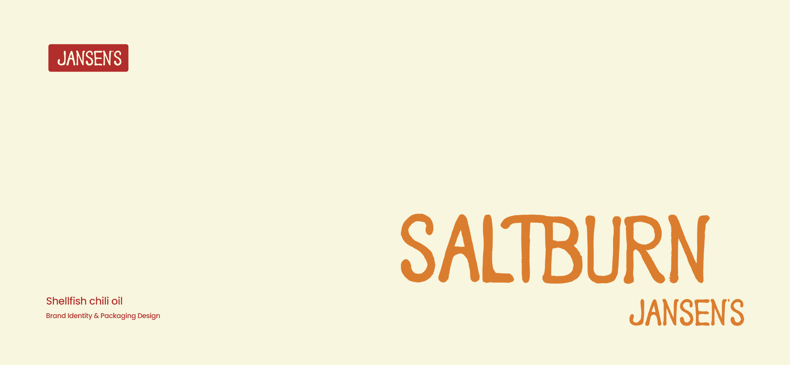 Een volledig brand identity systeem, logo, custom fonts, illustratie, verpakking en campagne, ontworpen in één week. Dit is het volledige proces van Salt Burn Jansen’s, een shellfish chili oil concept van Studio Cloudfairy.