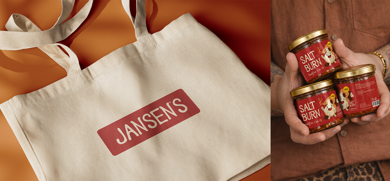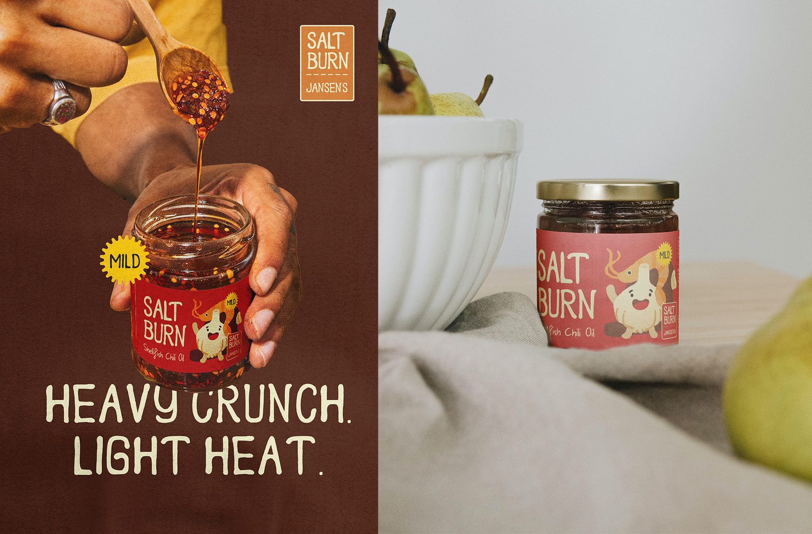 Het idee: een shellfish chili oil die niet intimideert maar uitnodigt. Speels, warm, voor iedereen. Rondom het product bouwden we een persona, Jansen, een chef die droomt van zijn eigen restaurant. Dat verhaal werd de basis van het hele merksysteem.
